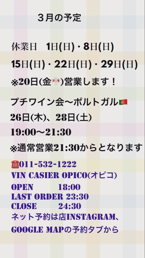 3月の予定です。休業日毎週日曜日です。